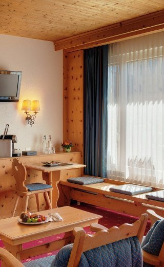 Warm und gemütlich, unsere 40m² grossen Junior Suiten sind in rot-blauem Bündner-Design gestaltet und verbreiten eine wunderschöne alpine Atmosphäre. Die Zimmer verfügen über zwei Einzelbetten und grosse Balkone mit Blick auf die Kirche und Berge (Jakobshorn). Auf der Belle Etage können Sie den Tag am Abend mit einem guten Glas Wein vor dem warmen Kamin ausklingen lassen. Die individuelle Gestaltung steht im Einklang mit der Geschichte des Gebäudes.