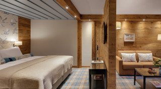 Zwischen der 1. und 5. Etage des Hauptgebäudes befinden sich unsere Junior Suiten, die nach Norden oder Süden ausgerichtet sind. Die Suiten zur Südseite verfügen über grosse Balkone mit Bergblick. Sie sind mit Eichenholz-Paneelen aus Altholz getäfert und modern eingerichtet. Das Design ist einzigartig. Alle Zimmer haben einen begehbaren Kleiderschrank, eine grosse Sitzecke mit einem Schlafsofa für einen dritten Gast (Kind). Die Badezimmer haben eine Badewanne oder Dusche. Diese Zimmer können mit dem Lift oder über das Treppenhaus erreicht werden.